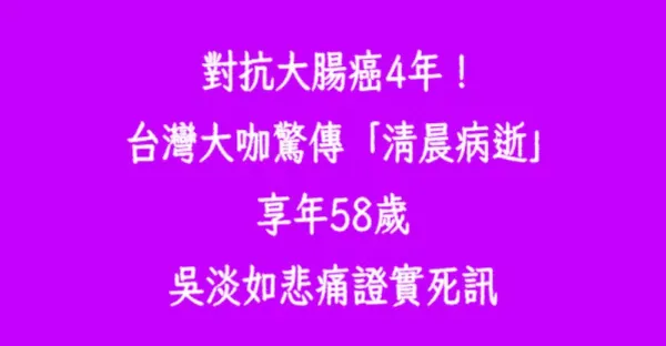 對抗大腸癌4年!台灣大咖驚傳「清晨病逝」享年58歲 吳淡如悲痛證實死訊.........