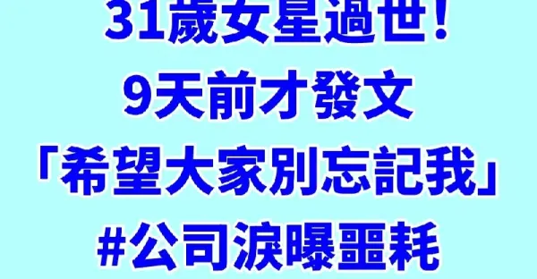午間快訊/31歲女星過世!9天前才發文「希望大家別忘記我」#公司淚曝噩耗