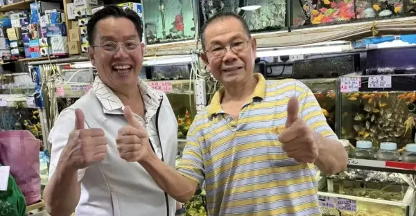 74歲譚詠麟到街邊小店,買了幾條金魚,不擺架子,和店主友好交談