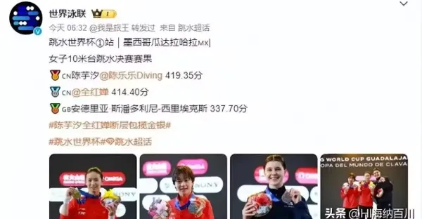 4月6日跳水世界盃戰報:中國四金一銀,陳芋汐雙冠,全紅嬋0冠