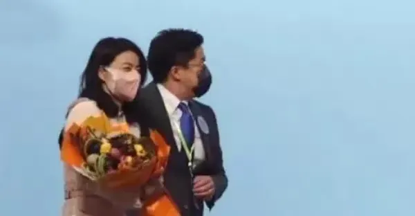 郭晶晶為了幫老公助陣,罕見燙頭髮隆重亮相,配粉色西裝溫柔賢惠~~