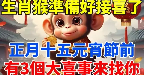 生肖猴請做好準備,正月十五元宵節前,將有3個大喜事來找你!家裡有屬猴的快來接!