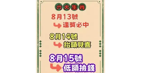 六大生肖:8月13號逢獎必中,14號抬頭見喜,15號低頭撿錢