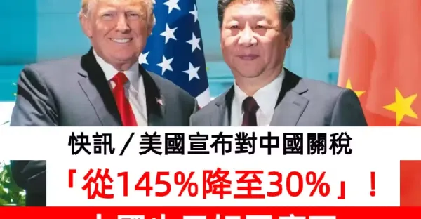 快訊/美國宣布對中國關稅「從145%降至30%」!中國也示好回應了