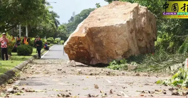 驚! 巨石突從山坡滾落 徑直砸在馬路上