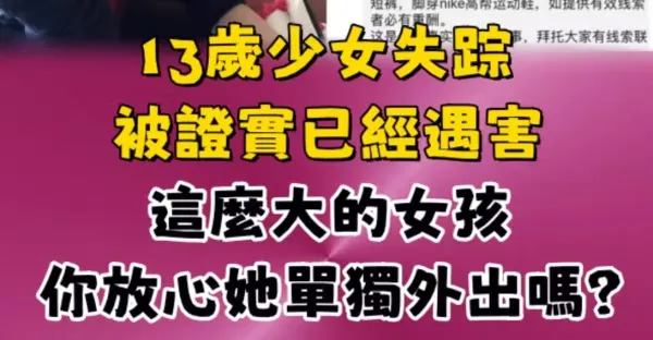 13歲少女失蹤被證實已經遇害,這麼大的女孩你放心她單獨外出嗎?警察:以後要教育好孩子!
