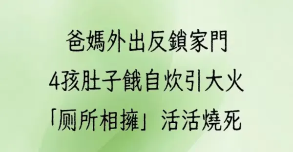 爸媽外出反鎖家門 4孩肚子餓自炊引大火!「廁所相擁」活活燒死……
