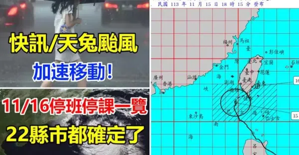 快訊 / 天兔颱風加速移動!全台「11/16停班停課」一覽,22縣市都確定了!!