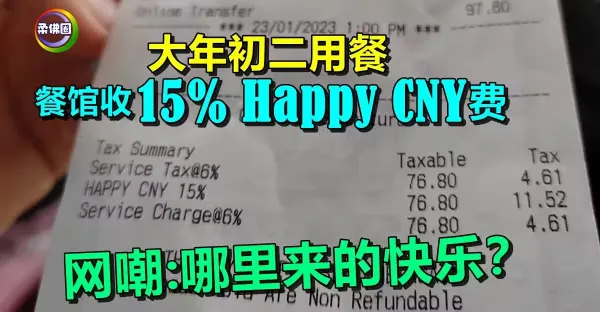 大年初二用餐 餐館收15%「新年快樂」費 網嘲:哪裡來的快樂?