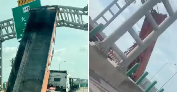 台61線砂石車撞爆路標!疑後車斗忘記降「下一秒悲劇上演」超扯畫面曝