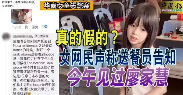 華裔女童失蹤案|真的假的? 女網民聲稱送餐員告知 今午見過廖家慧