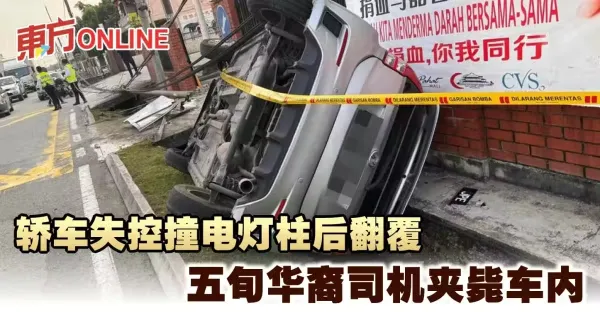 轎車失控撞電燈柱後翻覆 五旬華裔司機夾斃車內