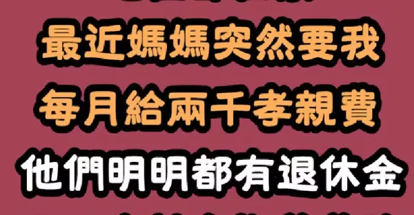 我月薪六萬多,吃住都在家,最近媽媽突然要我「每月給2千孝親費」他們明明都有退休金,而且本來就有撫養義務,我為什麼要給!