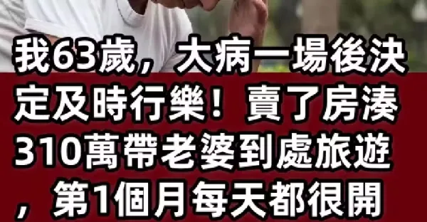 63歲那年大病一場後,決定及時行樂!賣了房湊310萬帶老婆到處旅遊,第1個月每天都很開心,但到第3個月「旅途中給老婆買了個金鐲子」才發現事情大條...