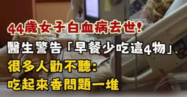 44歲女子白血病去世!醫生警告「早餐少吃這4物」很多人勸不聽:吃起來香問題一堆!