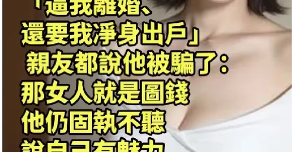 老公近60歲出軌36歲女,嫌棄我是老媽子!自稱找到真愛「逼我離婚、還要我凈身出戶」 親友都說他被騙了:那女人就是圖錢,他仍固執不聽,說自己有魅力,太寒心了「我心生一計...」不會讓他得逞!