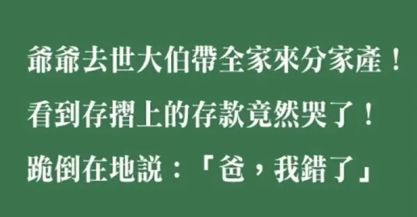 爺爺去世大伯帶著全家跑來分家產!看到存摺上的存款竟然哭了!跪倒在地說:「爸,我錯了」