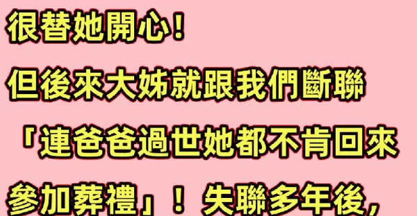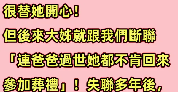 大姐遠嫁給有錢人,我去過她家一次看見房子很豪華,很替她開心! 但後來大姐就跟我們斷聯「連爸爸過世她都不肯回來參加葬禮」!失聯多年後,大姐過世時我去看外甥女「才發現她的真實目的」!