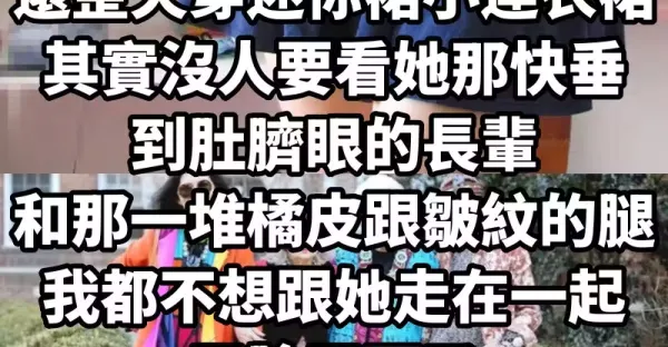 「婆婆都超過60了,還整天穿迷你裙、小連衣裙...其實沒人要看她那快垂到肚臍眼的長輩,和那一堆橘皮跟皺紋的腿!我都不想跟她走在一起,丟臉丟死了,而且小姑還一直猛夸,根本是想搶遺產吧...」 #反被網友罵翻