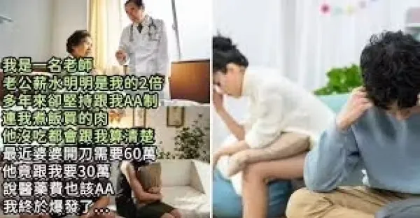 我是一名老師,老公薪水明明是我2倍,多年來卻堅持跟我AA制,連我煮飯買的肉他沒吃都會跟我算清楚!最近婆婆開刀需要60萬,他竟跟我要30萬說醫藥費也該AA,我終於爆發了...