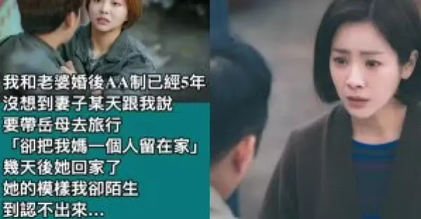 我和老婆婚後AA制已經5年,沒想到妻子某天跟我說,要帶岳母去旅行「卻把我媽一個人留在家」,幾天後她回家了,她的模樣我卻陌生到認不出來了!