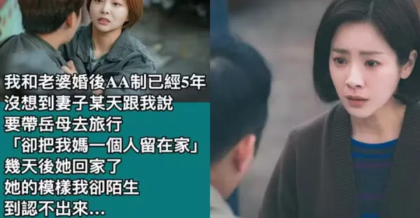我和老婆婚後AA制已經5年,沒想到妻子某天跟我說,要帶岳母去旅行「卻把我媽一個人留在家」,幾天後她回家了,她的模樣我卻陌生到認不出來了