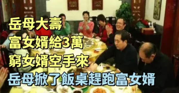 岳母大壽,富女婿給3萬,窮女婿空手來,岳母掀了飯桌趕跑富女婿!