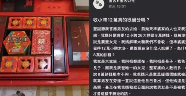 結婚時,我們家要求12萬小聘和8萬餅錢,結果婆婆卻嗆我「爸媽是在賣女兒」….甚至還懷疑我下符,結個婚兩家人鬧翻天,實在是頭痛…