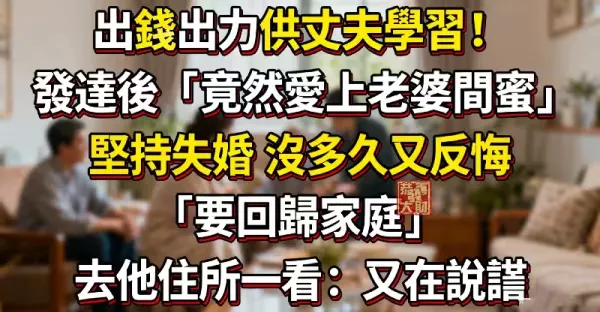 出錢出力供丈夫學習!發達後「竟然愛上老婆閨蜜」堅持失婚 沒多久又反悔「要回歸家庭」去他住所一看:又在說謊!