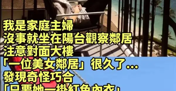 我是家庭主婦,沒事就坐在陽台觀察鄰居,注意對面大樓「一位美女鄰居」很久了...發現奇怪巧合「只要她一掛紅色內衣」老公當天就會加班! 於是那晚我鼓起勇氣「按了她家的門鈴」...