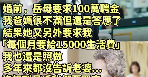 婚前,岳母要求100萬聘金,我爸媽很不滿但還是答應了! 結果她又另外要求我「每個月要給15000生活費」我也還是照做,多年來都沒告訴老婆...沒想到最近我們要買房「岳母偷偷遞給我一本存摺」我一看傻了😲