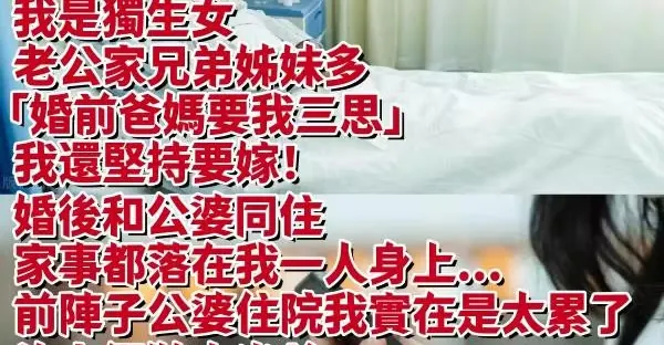 我是獨生女,老公家兄弟姊妹多「婚前爸媽要我三思」我還堅持要嫁! 婚後和公婆同住,家事都落在我一人身上...前陣子公婆住院我實在是太累了,決定假裝去出差「5天後接到老公電話」我不敢相信自己的耳朵😱