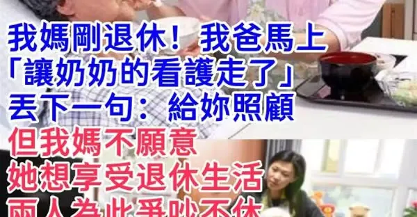 我媽剛退休!我爸馬上「讓奶奶的看護走了」丟下一句:給妳照顧… 但我媽不願意,她想享受退休生活,兩人為此爭吵不休,這時「我突然說了1句話~」爸爸瞬間沉默了