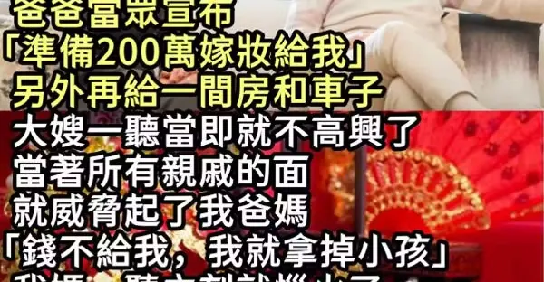 爺爺生日宴上,爸爸當眾宣布「準備200萬嫁妝給我」另外再給一間房和車子,大嫂一聽當即就不高興了,當著所有親戚的面就威脅起了我爸媽,「錢不給我,我就拿掉小孩」 我媽一聽立刻就惱火了,下一秒媽媽說的話讓大嫂直接愣在了原地