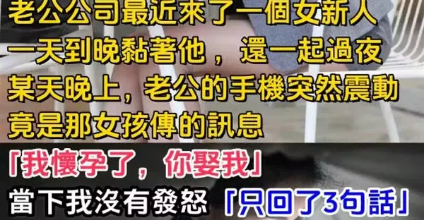 老公公司最近來了一個女新人,一天到晚黏著他,還一起過夜⋯某天晚上,老公的手機突然震動,竟是那女孩傳的訊息:「我懷孕了,你娶我」。當下我沒有發怒「只回了3句話」,成功挽回婚姻~