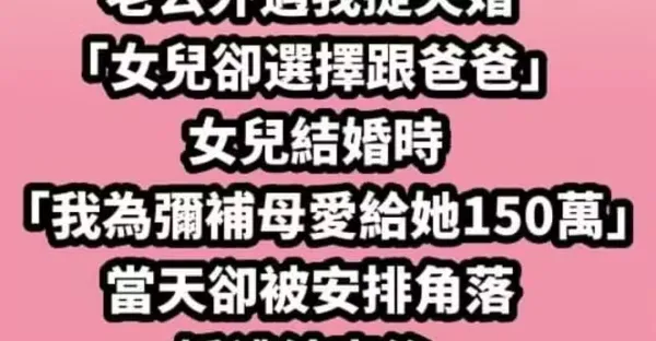 我長得不好看又賺得比老公少! 老公外遇我提失婚「女兒卻選擇跟爸爸」...女兒結婚時「我為彌補母愛給她150萬」當天卻被安排角落,婚禮結束後「她又登門提一要求」我才恍然大悟~