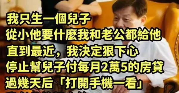 我只生一個兒子,從小他要什麼我和老公都給他。 直到最近,我決定狠下心「停止幫兒子付每月2萬5的房貸」,過幾天后「打開手機一看」我老公放聲大笑~
