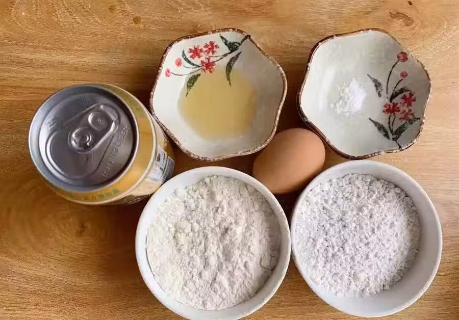 麵粉100克,紅薯澱粉100克,食用油10克,泡打粉2克,鹽2克,雞蛋1顆,啤酒適量。