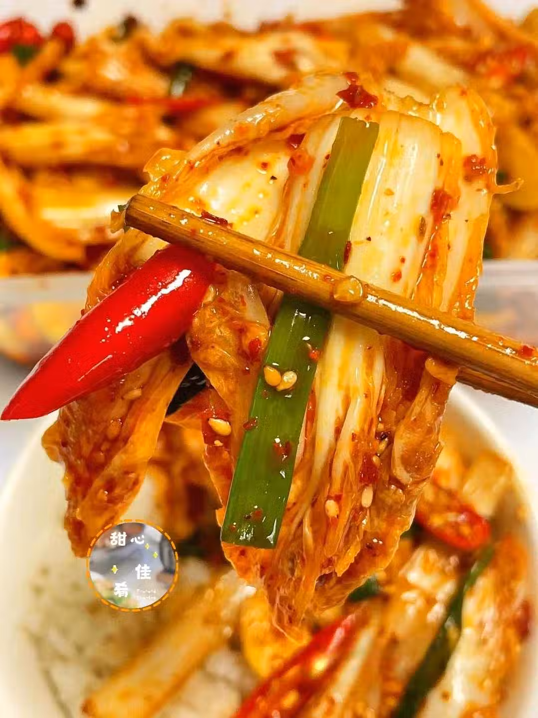 娃娃菜腌出水分後捏干備用,倒入小米辣,蔥段和蒜片,粗細辣椒粉各1勺,倒入熱油爆香。