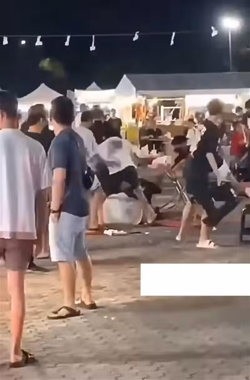 該條視頻僅有短短越4秒,畫面顯示4、5名戴著黑色口罩的華裔男子,正在對一個倒地抱頭的白衣男子拳打腳踢,間中更有人直接拿起夜市攤主擺放的塑料椅子,直接砸向被毆打的男子。