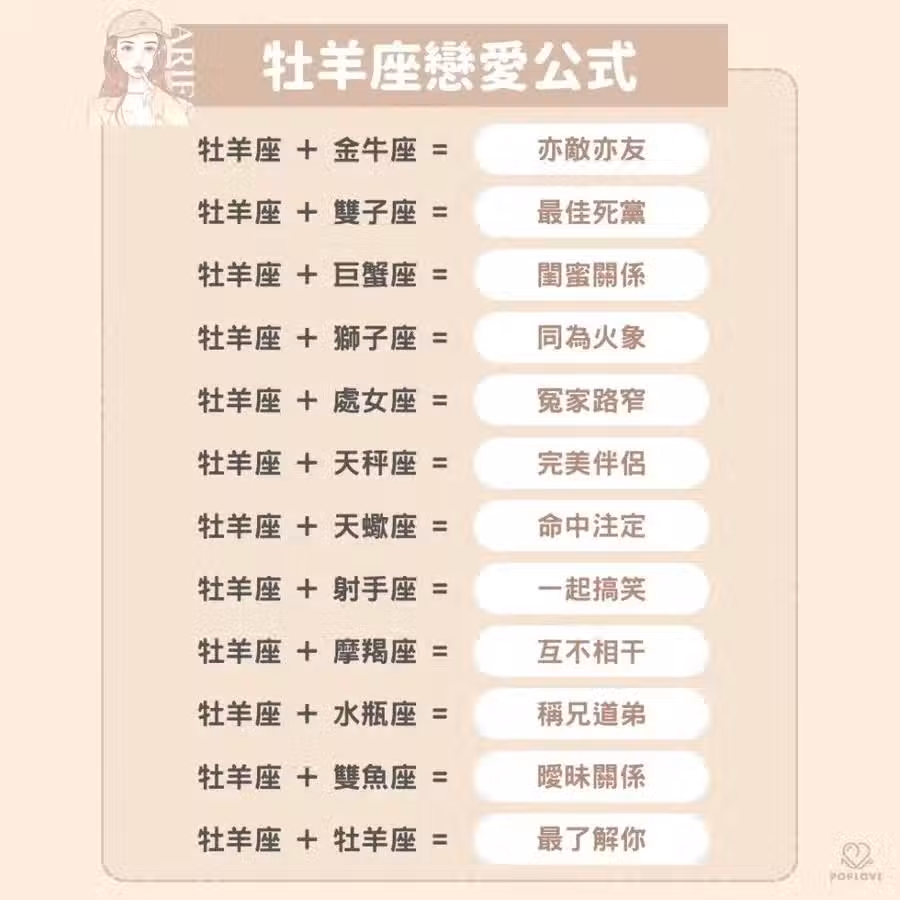 坦率的牡羊座在感情上也會直接表達自己的情緒,所以能接受他們真誠又沒修飾的表達,在一起相處其實是舒服的,不用互相猜疑。兩個牡羊配在一起雖然很有可能會大吵但也是最了解彼此的那個人!