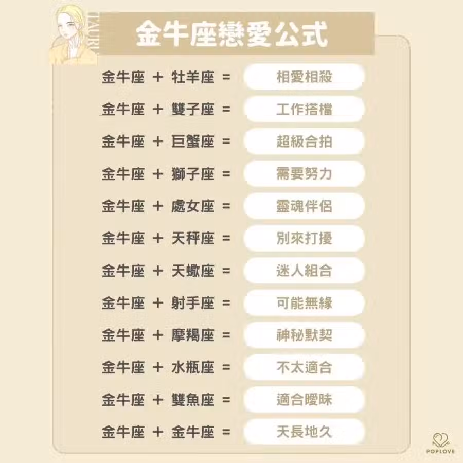 在愛情上較為木訥的金牛座需要較主動的人來帶動和激發他們的戀愛能力。然而兩個金牛在一起也會是蠻合拍的,因為大家的金錢觀念都很相似。