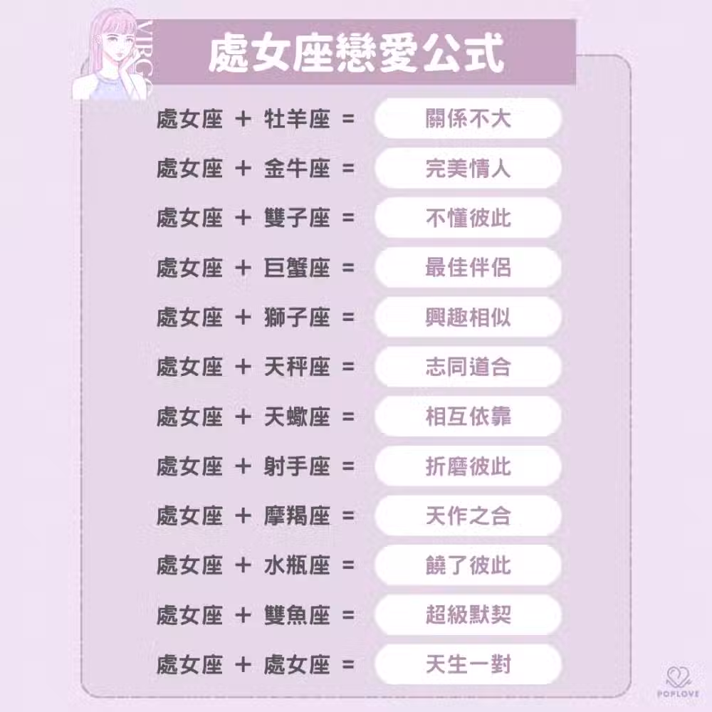 完美主義的處女對自己要求高,對另一半的標準更嚴苛,並不是每個人都能忍受他們的挑剔。兩個處女在一起不是大好就是大壞,兩個愛完美的人在一起就是完美的組合,但也有可能會因為在意的點不同而互相挑剔對方。