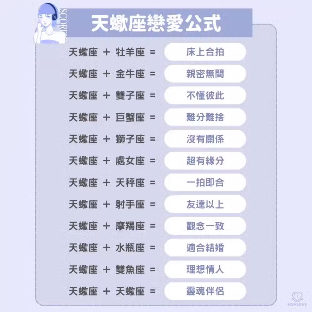 想要真正進入神秘天蠍的心裡那真的是太難了!但成功攻陷他們的心後會發現天蠍寶藏的一面,只會讓你越來越愛他。兩個天蠍在一起應該會在床上切磋看看誰的實力更厲害~~