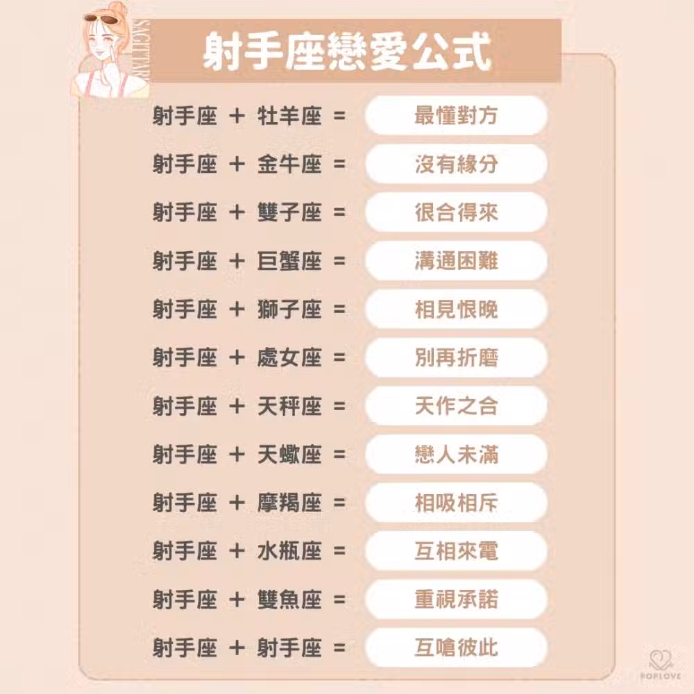 射手座是大家眼中的開心果,但其實那只是他們的保護色!跟他們合得來的人一定是同樣也嚮往自由或願意給自由的人。兩個射手在一起就是兩個情場高手切磋看看誰更厲害吧~