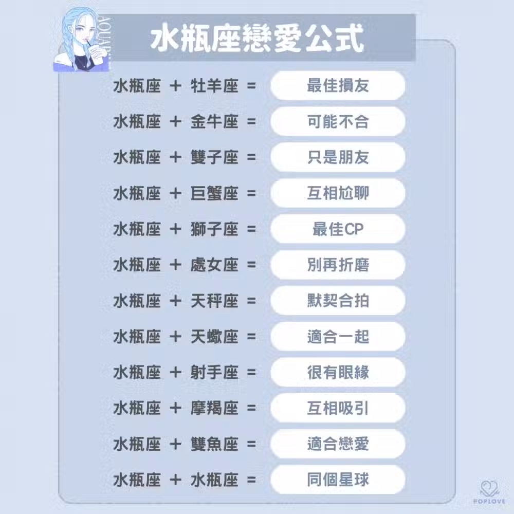一般人其實很難get到水瓶的想法,但是兩個水瓶搭配在一起就是個很神奇的組合,交往之後意外發現兩人的思維都很跳,剛好對方也跟得上還挺有默契的。