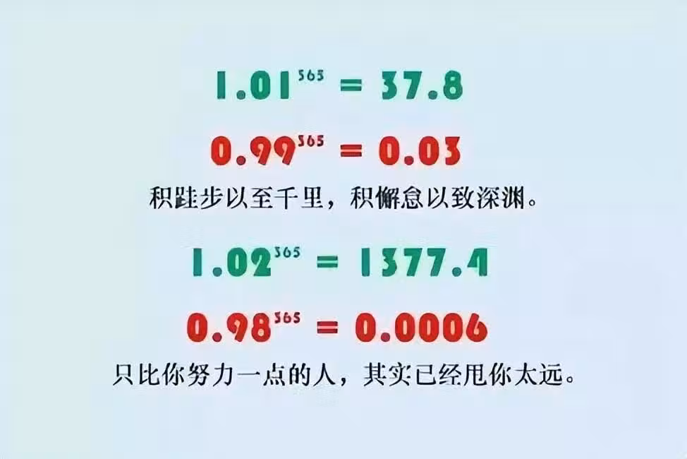 如果把這0.01的差異比作堅持自律的好習慣,經過日復一日的疊加,自律者扶搖直上,不自律者困在原地。久而久之,兩者之間就產生了不可逾越的鴻溝。
