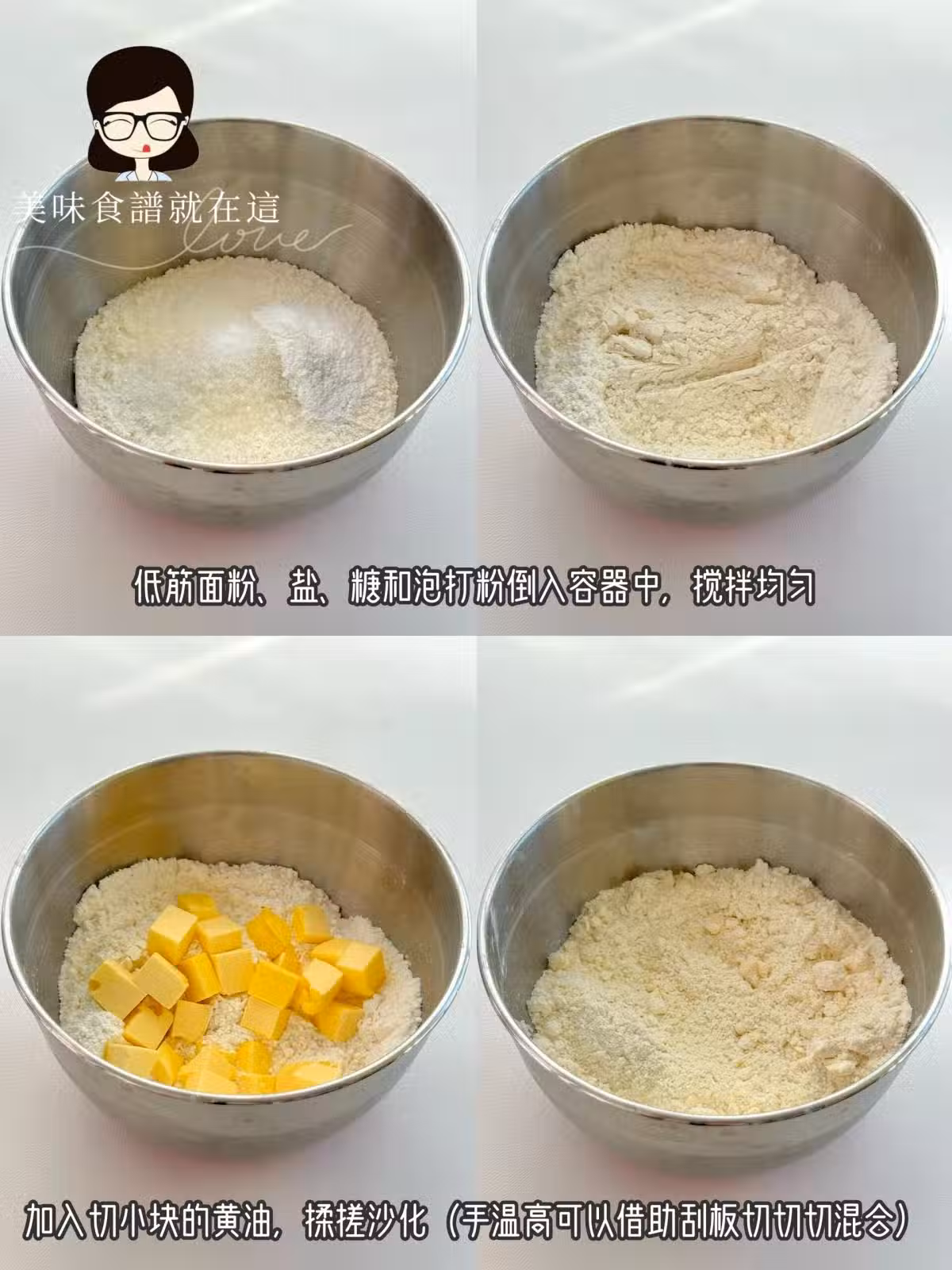 ①低筋麵粉、鹽、糖和泡打粉倒入容器中,攪拌均勻