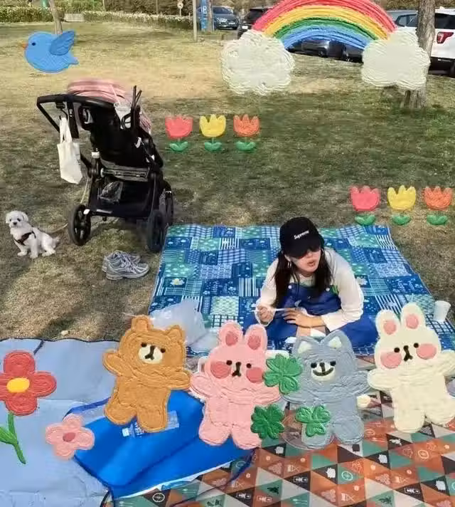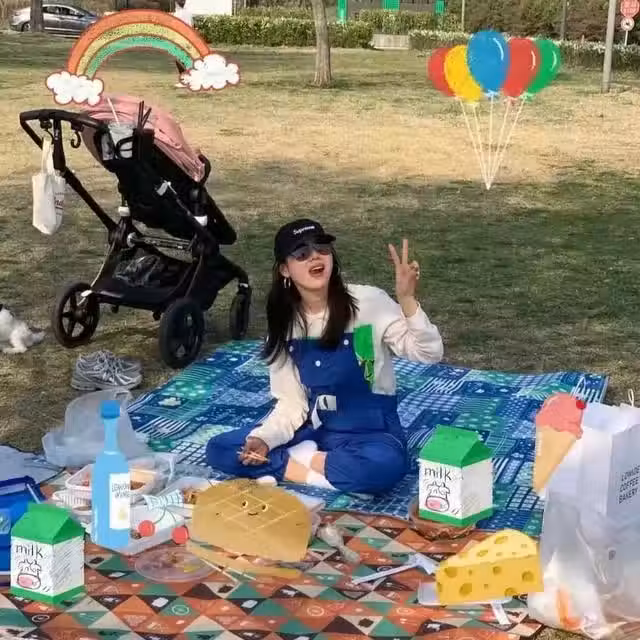 孫藝珍一身藍色背帶牛仔褲搭配白色衛衣,戴著黑色棒球帽,坐在野餐布上,上面擺滿了美食和孩子的奶粉,她一邊享受美食,一邊擺著剪頭手。