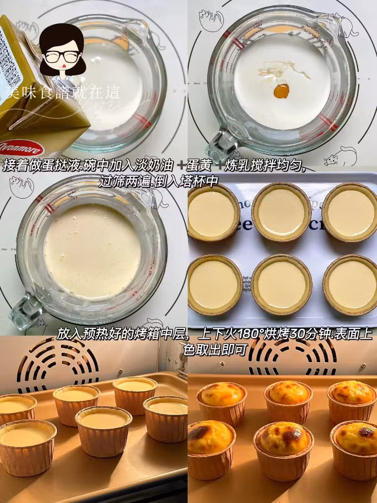 3️⃣接著做蛋撻液.淡奶油➕蛋黃➕煉乳攪拌均勻過篩兩遍,倒入塔皮約八分滿
